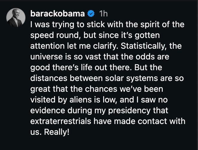 So let’s look at what was really said this week. On the original interview, Obama said aliens were real, but that the major conspiracy elements of recovered crashed vehicles were false. He later clarified he was just stating his opinion based on the law of averages.